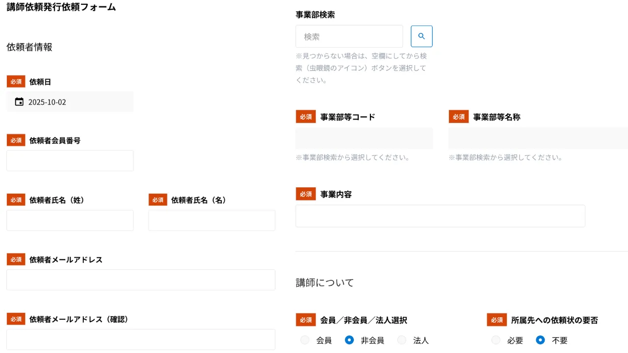 こちらが、「講師依頼発行依頼フォーム」の実際の画面です。