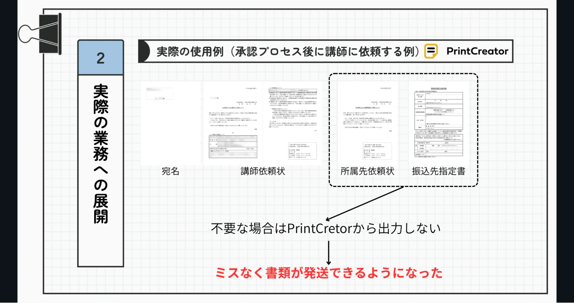 そのため、必要なら一緒に出力して、不要であれば宛名と講師依頼状だけが出力されるという形で、ミスなく書類を送れるよう工夫しました。