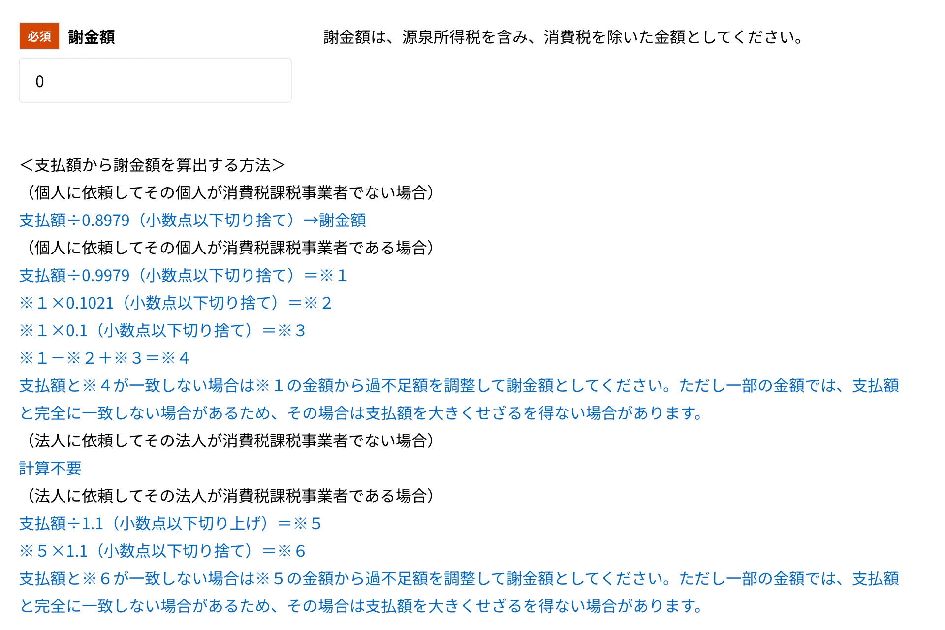 また、一番大事な謝金額についてですが、税金の関係もあり間違いが多かったため、ラベルを使ってフォーム上に計算式を載せました。