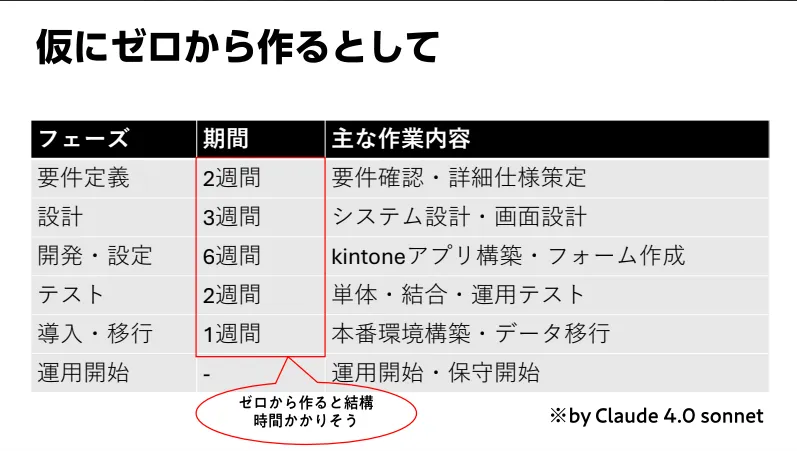 まず、仮にゼロからWeb予約システムを作るとどれぐらいの時間がかかるのかAIのClaudeに聞いたところ、以下のような結果が出てきました。