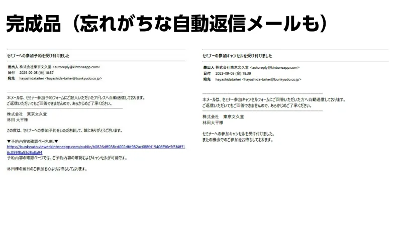 予約をすると予約完了メールが届き、予約をキャンセルするとキャンセル完了メールが自動で送られる仕組みです。