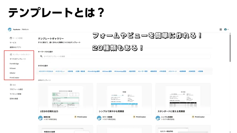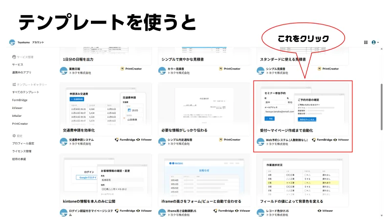 テンプレートギャラリーには、今回ご紹介いただいた「受付〜マイページ作成まで自動化」のテンプレート以外にも、様々な活用シーンに合わせたテンプレートを用意しています。(トヨクモ製品未契約の方もご覧いただけます)
