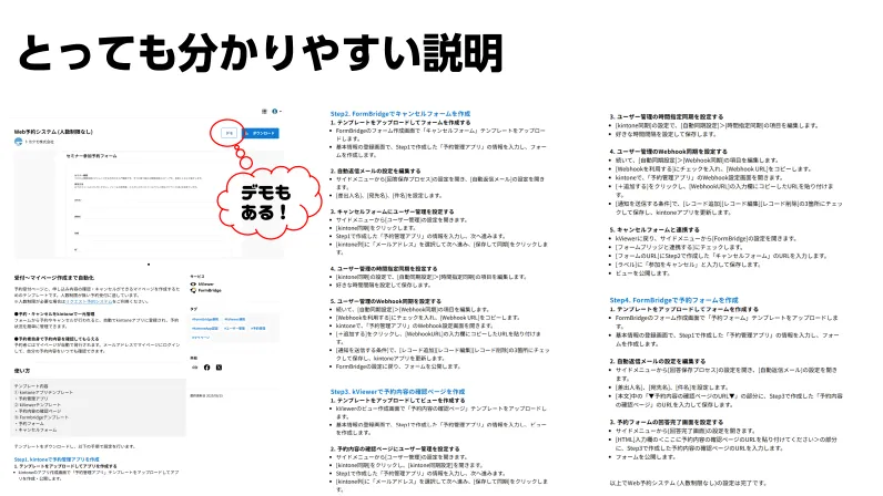 事前にデモを見ることもできるため、ステップ通りにやればイメージ通りの形で作成可能です。