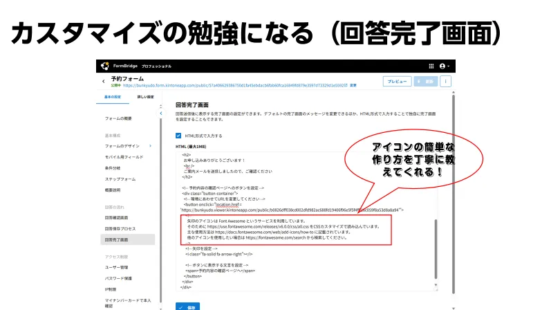その他、回答完了画面のHTMLを見てみると、アイコンの簡単な作り方の説明なども記載されていて、カスタマイズの勉強になるので、この点もいいと感じました。