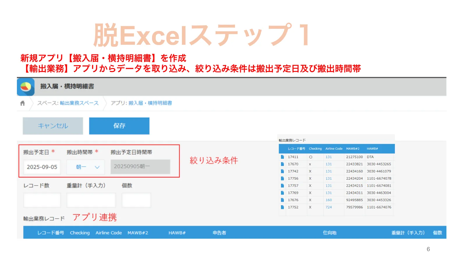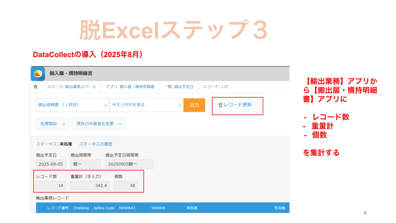 この搬入届・横持明細書アプリでは、輸出業務アプリから、輸出業務レコードを関連レコードとして表示し、DataCollectで「レコード数・重量計・個数のデータ」を集計します。