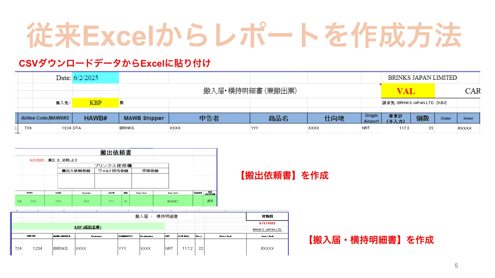 最後に、CSVファイルを元に、Excelで「搬出依頼書」と「搬入届・横持明細書」を作成するというのが従来のフローです。