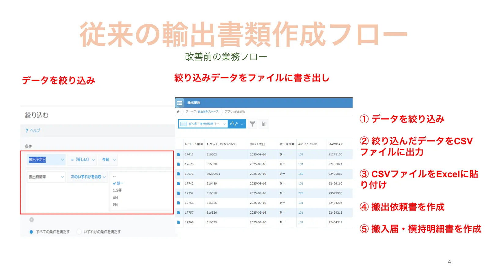 従来の業務フローを、より詳細にお伝えします。作成する書類は、輸出書類(搬出依頼書・搬入届)です。