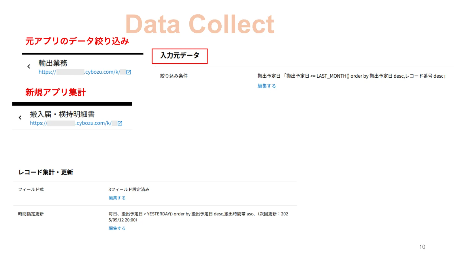 まず、入力元データの絞り込み条件ですが、「搬出予定日>=LAST_MONTH」とあるように先月からのデータを取ってくるようにしています。