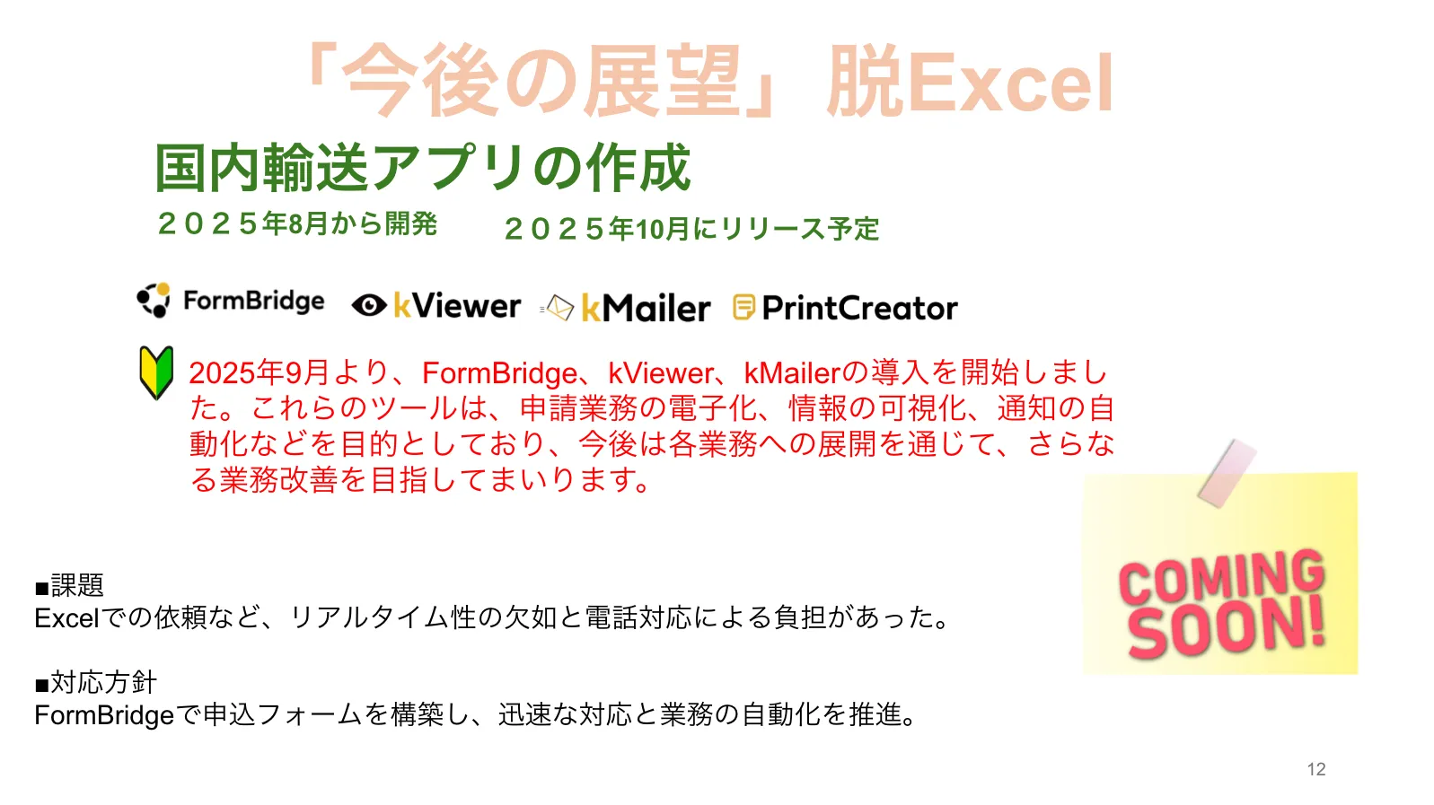 そこで、2025年9月よりFormBridge、kViewer、kMailerを導入してリアルタイム性を確保したシステムを構築しようと動いている最中です。