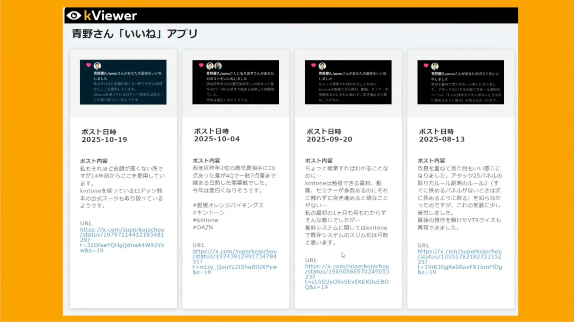 こちらは、サイボウズ社長の青野さんからXで「いいね」が来たら、そのスクリーンショットと共に日時などの情報をkintoneに登録し、それがビューで公開されるというものです。