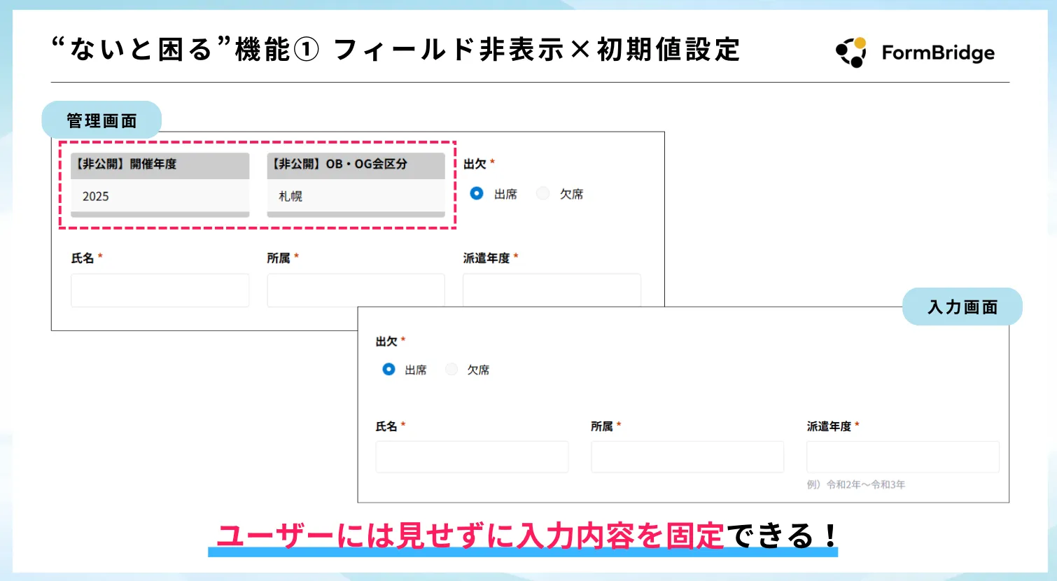 ないと困る機能の1つ目として、FormBridgeのフィールド非表示と初期値設定の機能を紹介します。OBOG会の出欠確認のフォーム等で活用しています。