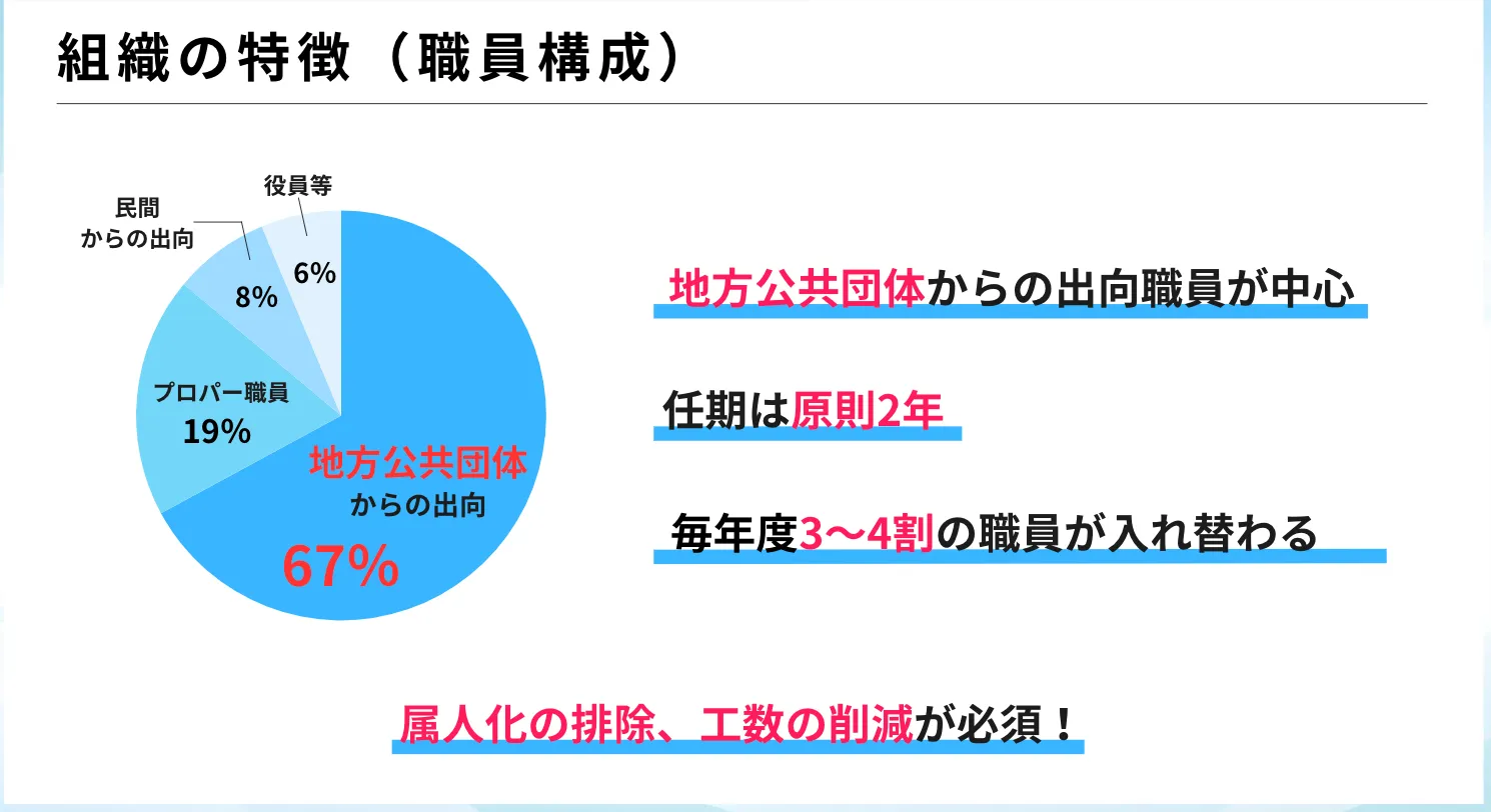 職員構成はかなり特殊で、約7割が地方公共団体からの出向の職員で成り立っています。任期が原則2年のため、毎年度3〜4割の職員が入れ替わる職場です。