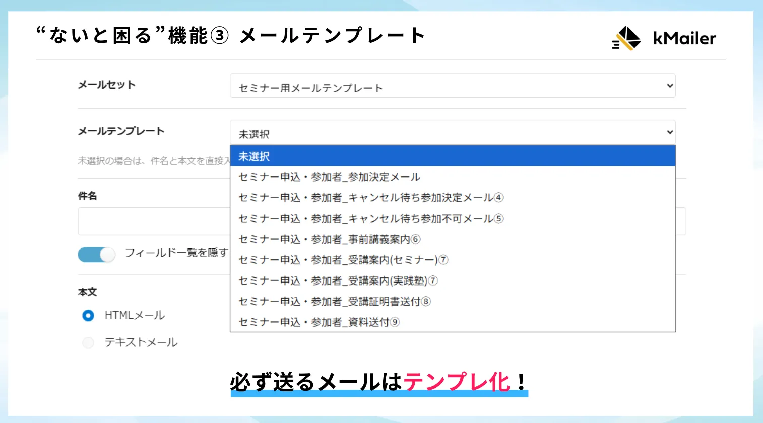 ないと困る機能3つ目は、基本機能のメールテンプレートです。