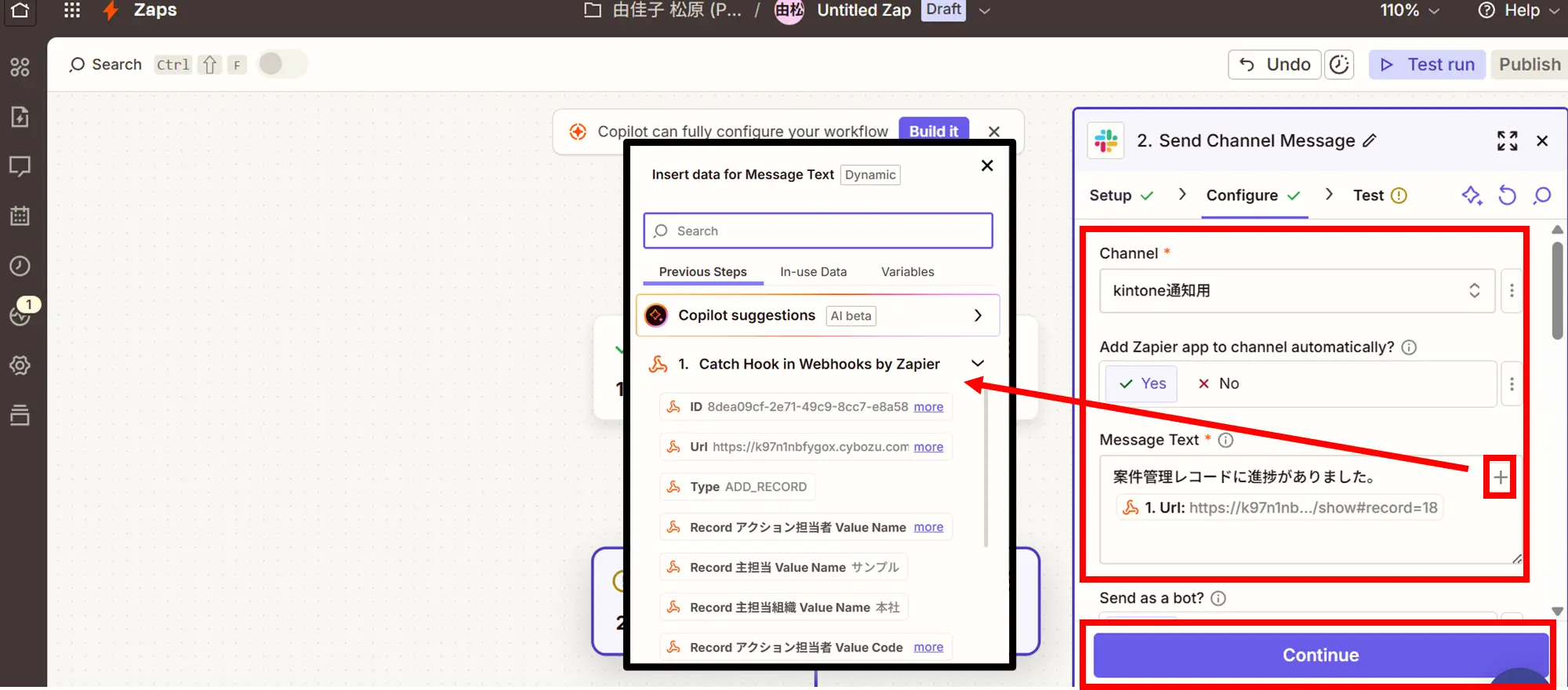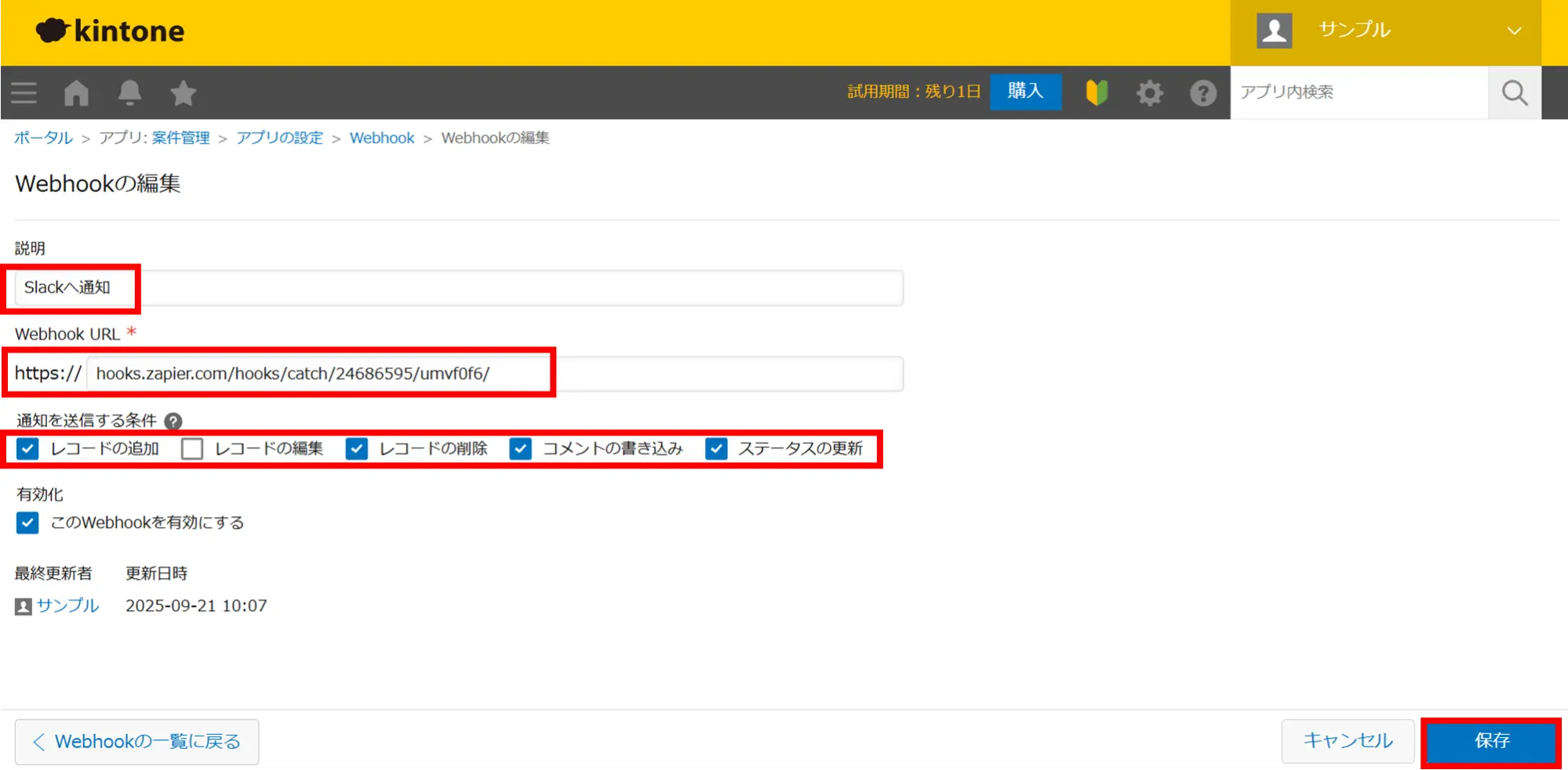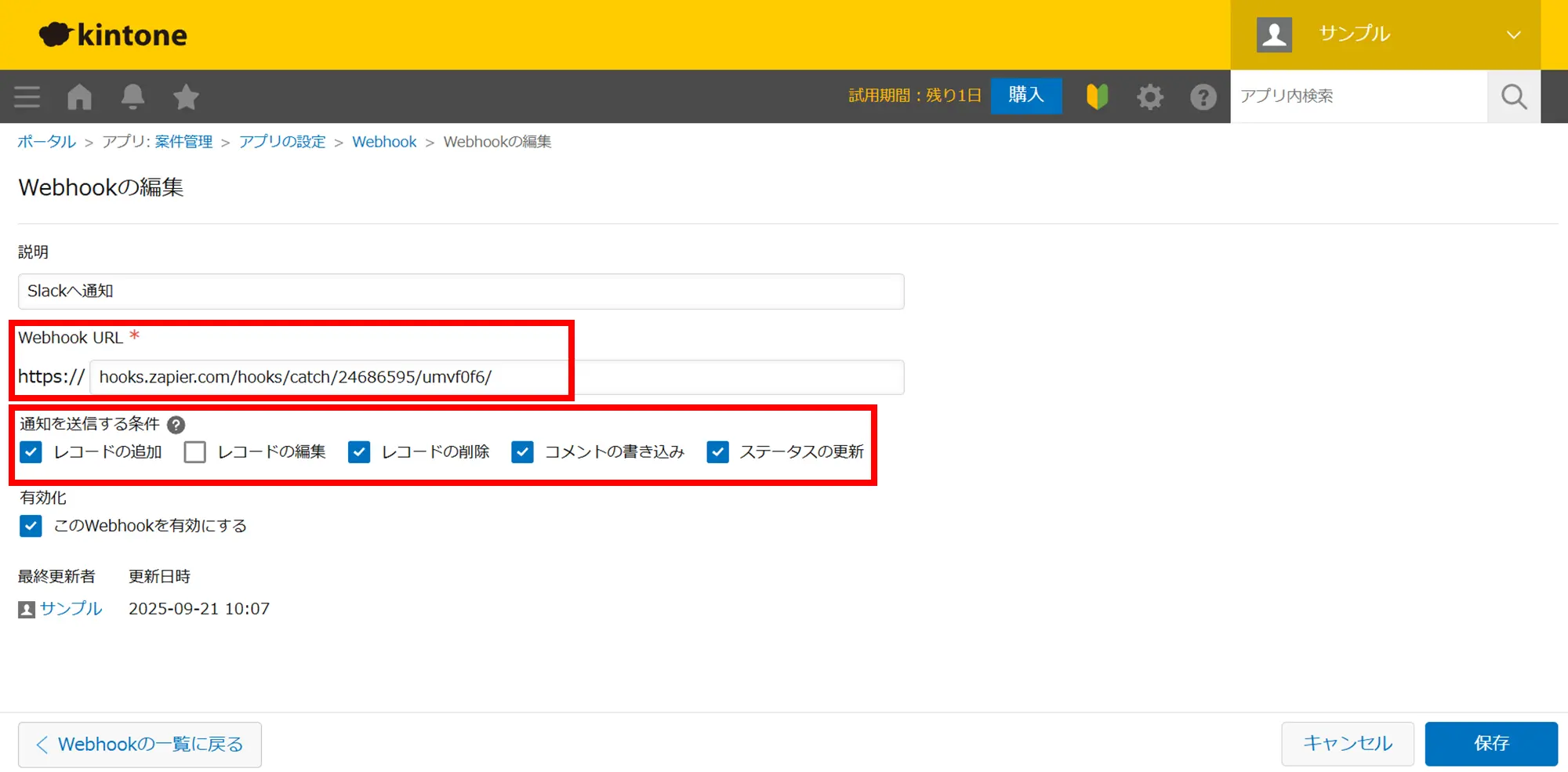 「Webhook URL」には、すでに「https://」が入っているため、前の工程でZapierで作成したURLのhttps://以降を貼り付けましょう。
