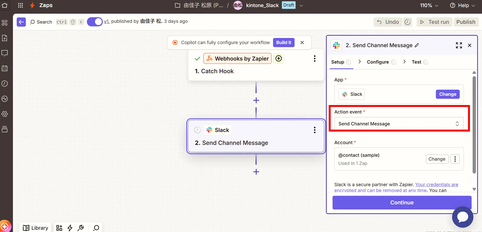 「channel」では、前の手順で作成した、Slackでお知らせしたいチャネルを選択します(この段階で新しいchannel作成も可能です)。