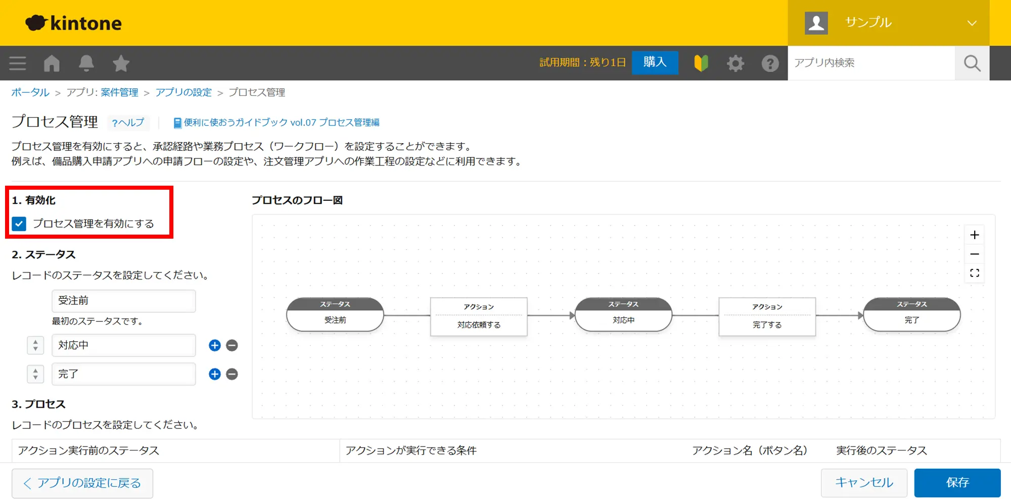 以下の記事では、kintoneアプリに「プロセス管理」を設定する方法について詳しく解説しておりますので、ぜひお読みください。