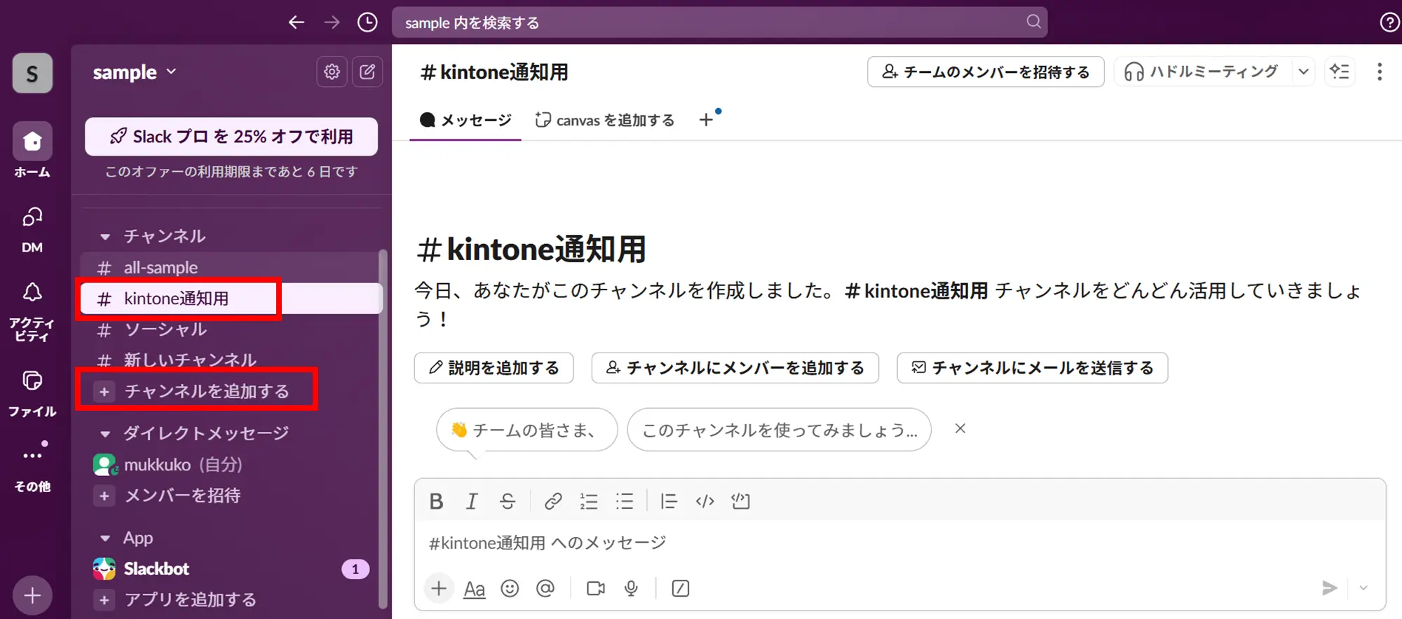 今回は「kintone通知用」のチャンネルを作成してみました。