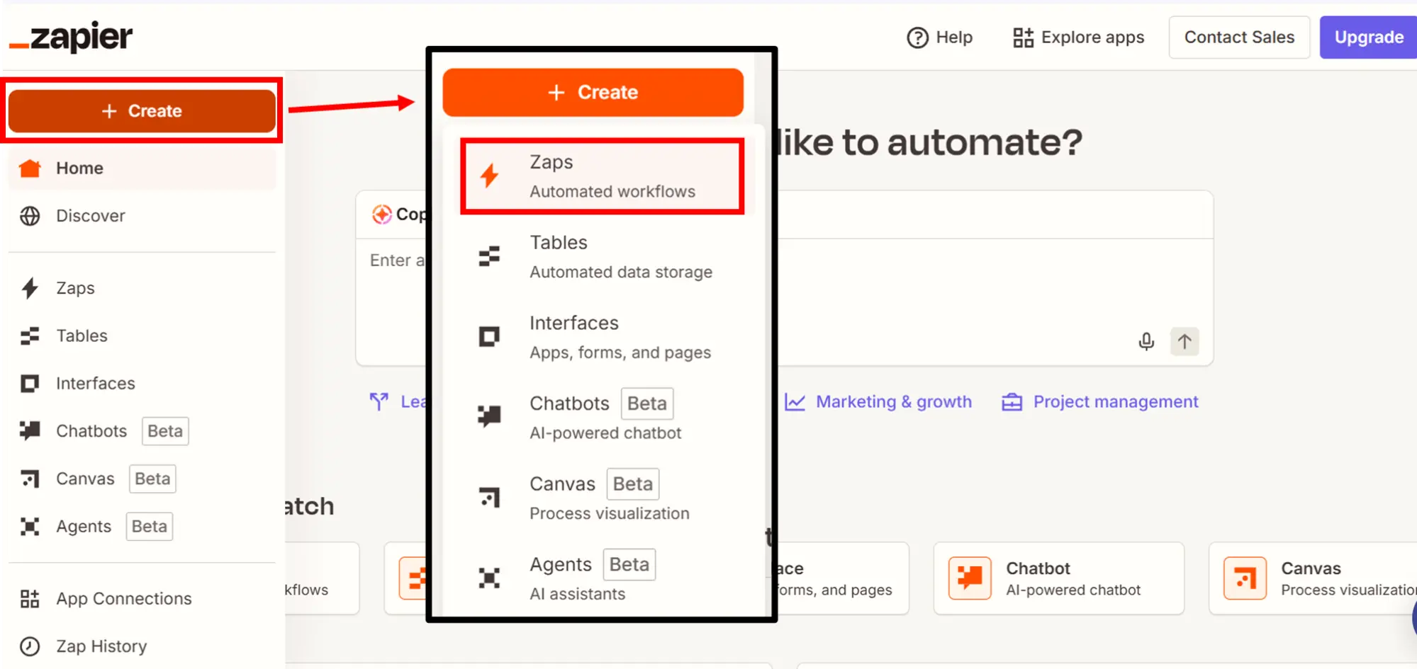 すると、何を作るのかの画面が出るので、「Zaps」をクリックしましょう。
