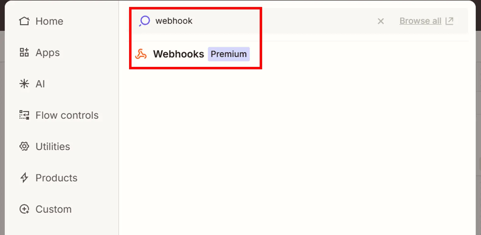 検索画面が出るので、「Webhook」と検索し、出てきた「Webhooks」をクリックします。