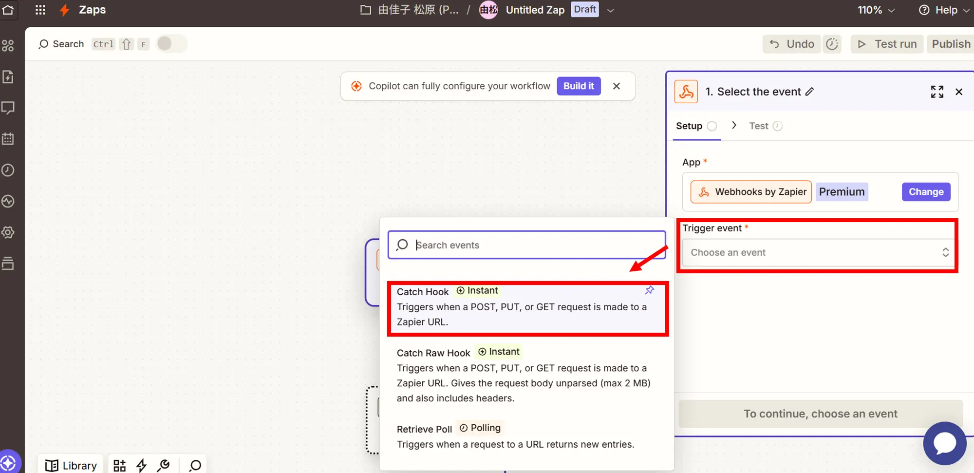 「Triger event」の下をクリックし、出てきたポップアップの「Catch Hook」をクリックします。