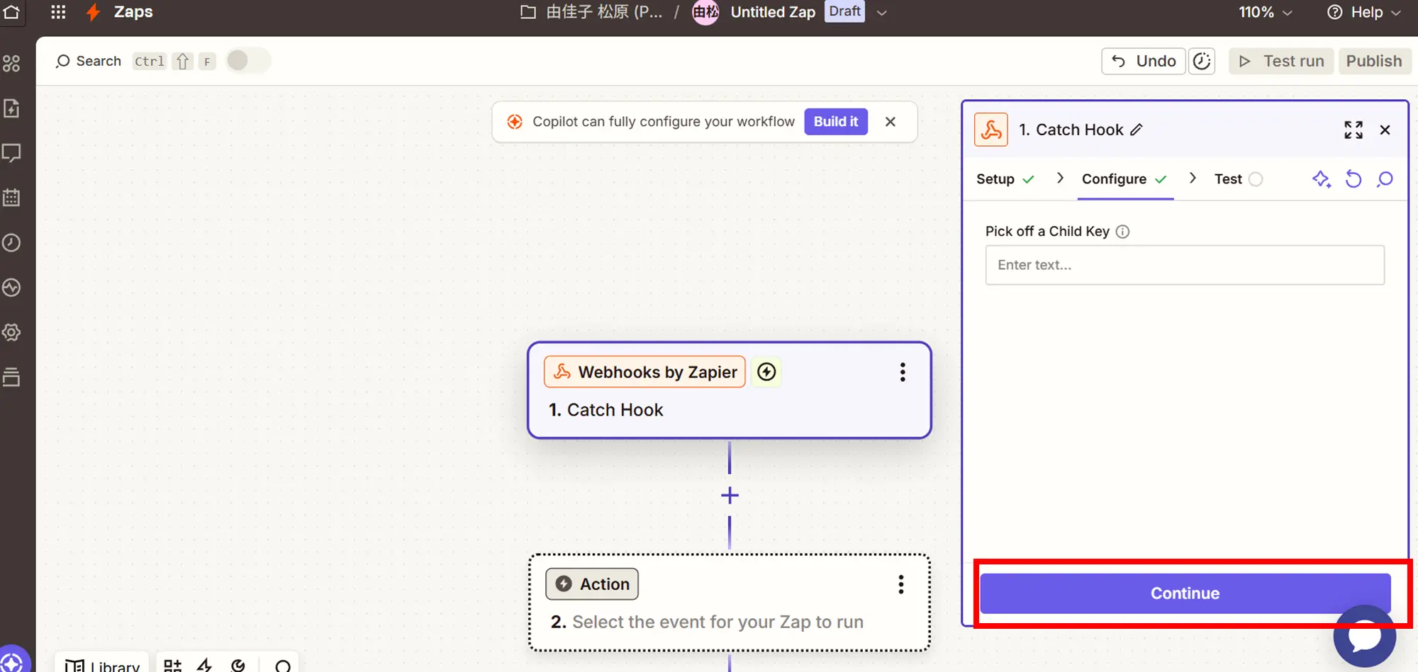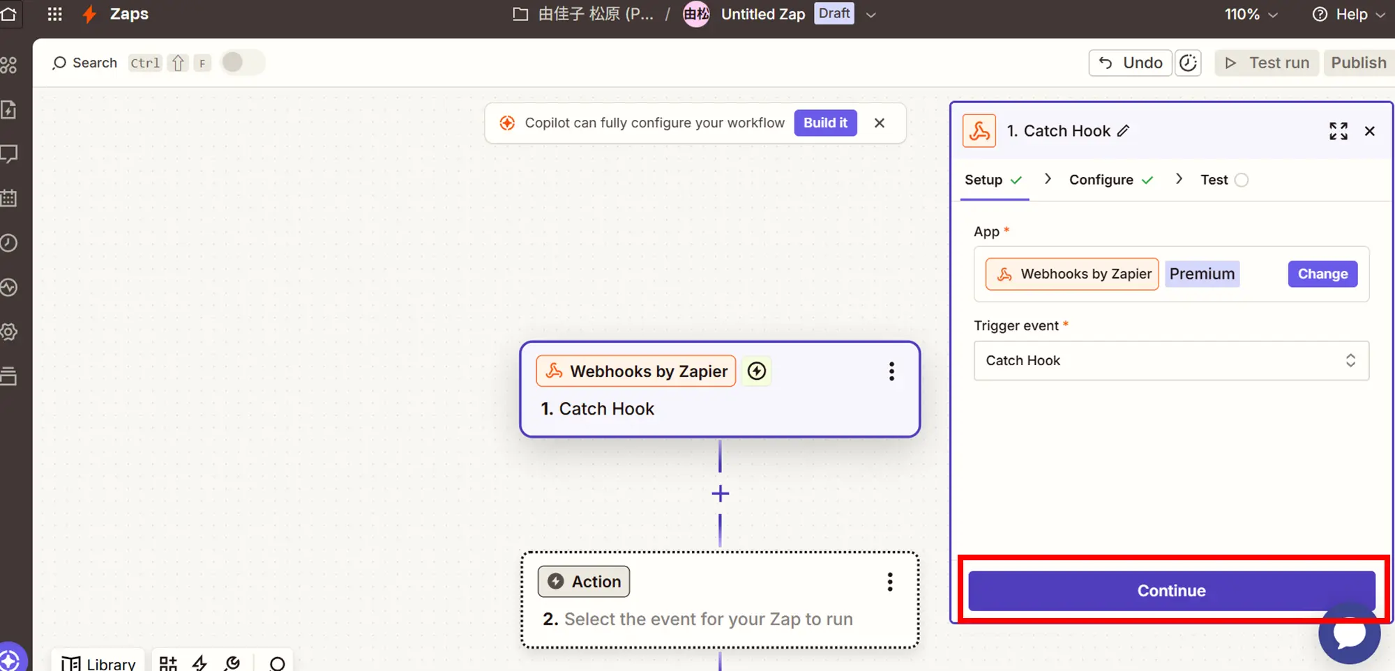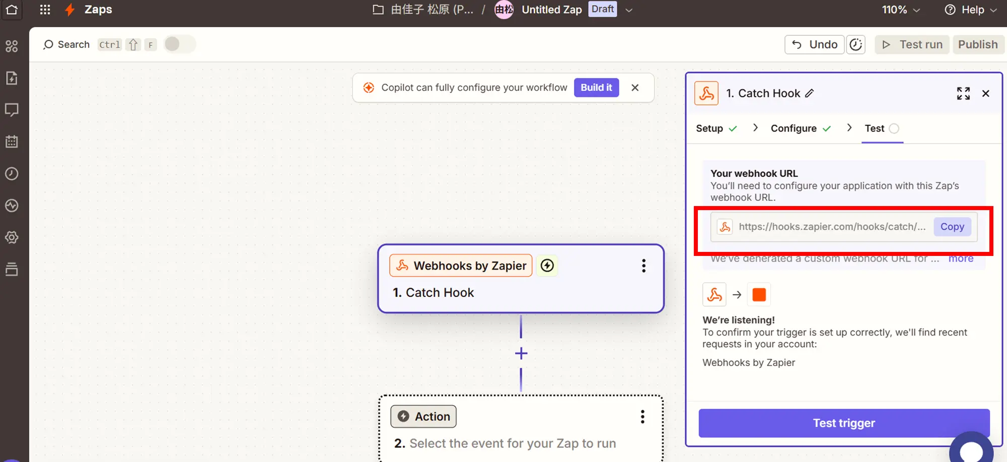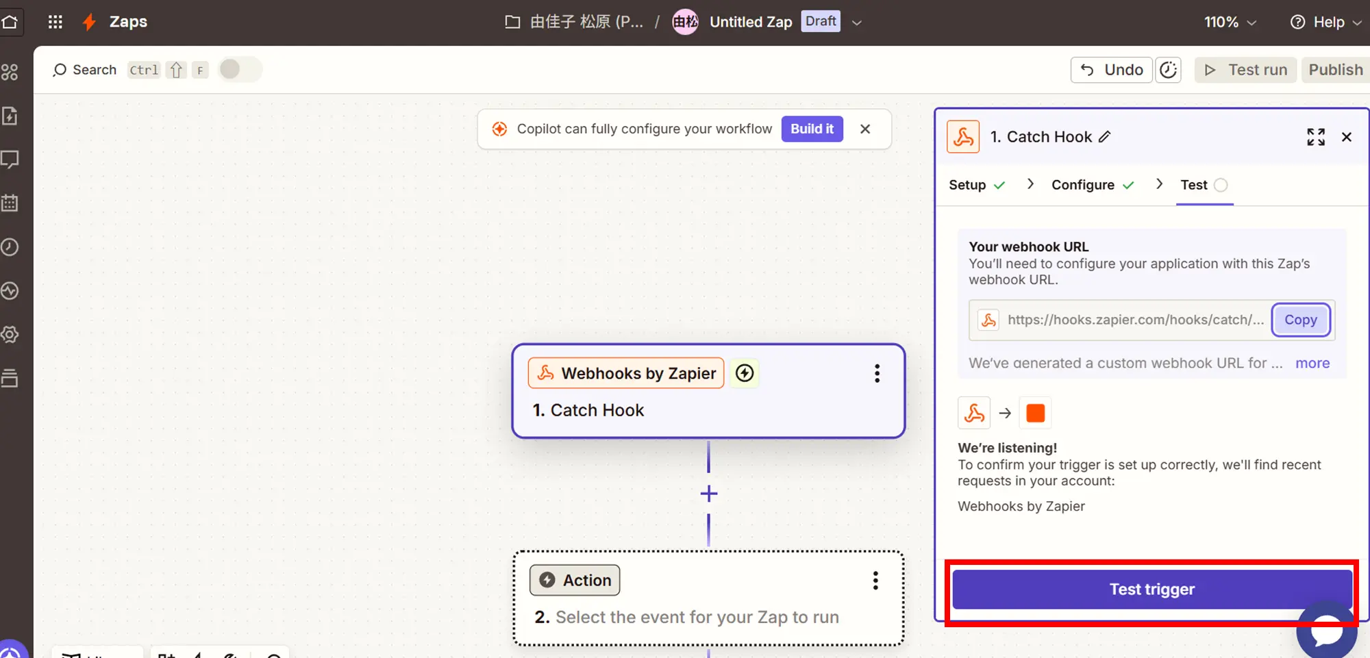 【手順2】Zapier(Webhook連携支援ツール)でのトリガー設定を行う