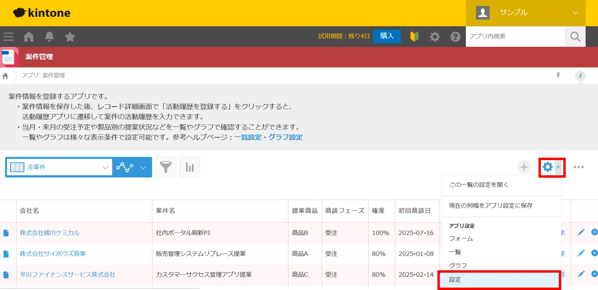今回Webhookを設定したい「案件管理アプリ」の歯車マーク横の下矢印をクリックし、「設定」を選択します。