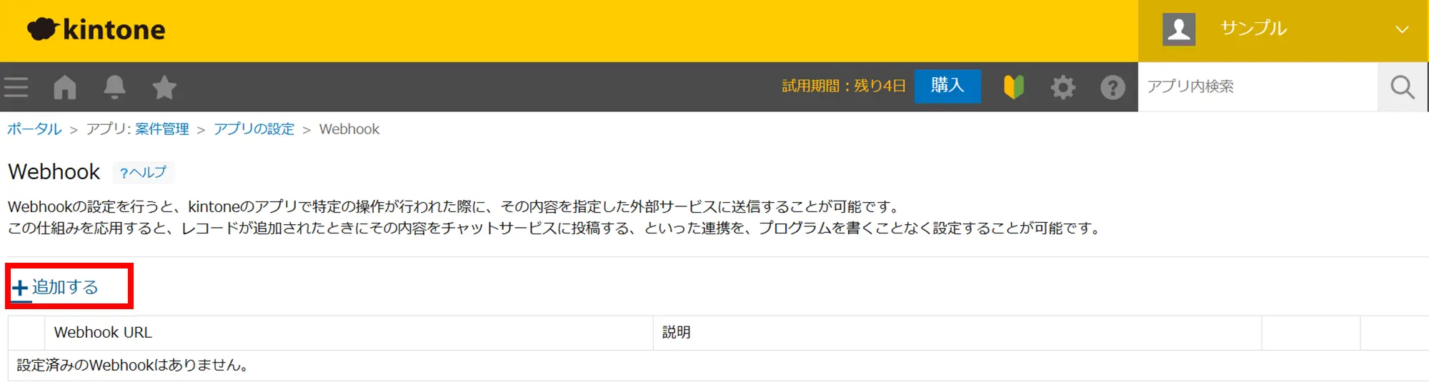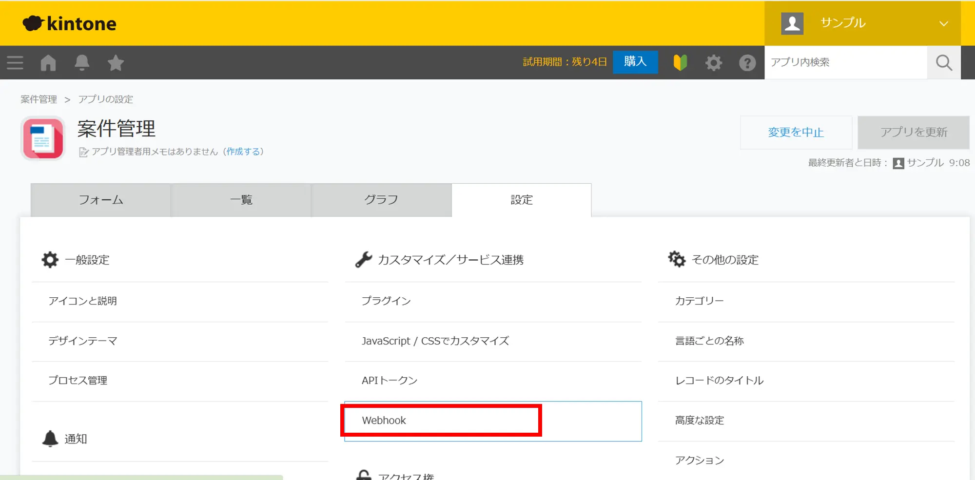 kintoneのスタンダードコースでは、通知機能を補完する「Webhook機能」があります。