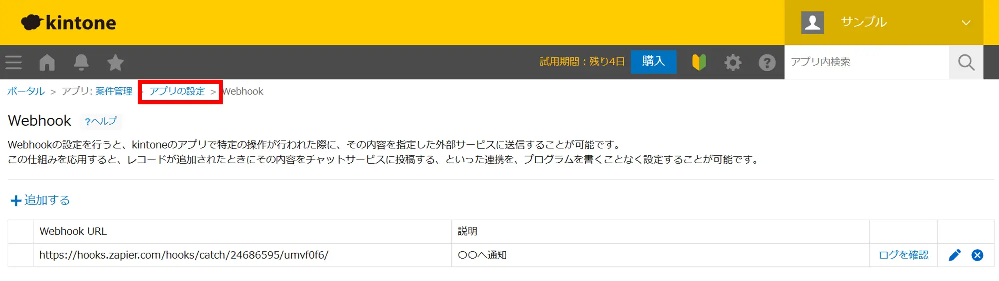 Webhookが追加されたので、上の「アプリの設定」をクリックします。