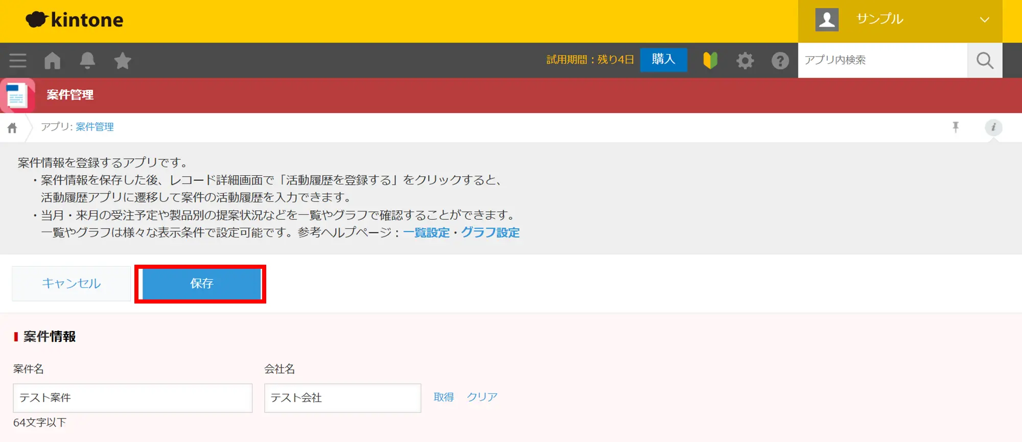 さらに、このタイミングで、のちほどテストできるように、案件管理に実際に一件登録しておきましょう。