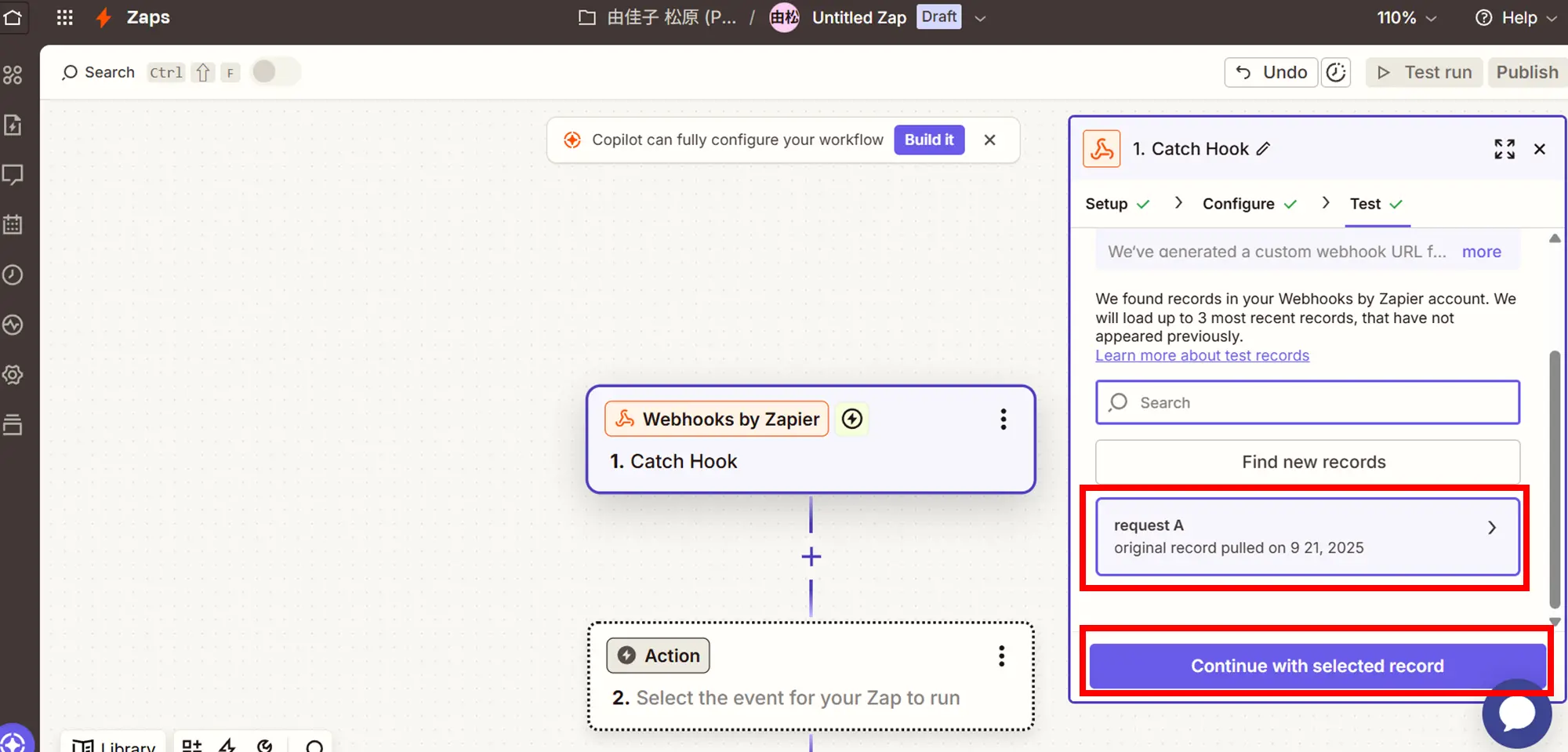 「request A」の枠が出ればテストが成功したので、「Continue with selected record」をクリックします。