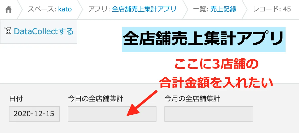 こちらが全店舗の集計金額を保存するアプリ(①)のデータコレクトの画面です。