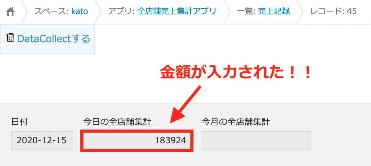 この状態でレコード上部にある 「DataCollectする」ボタンをクリックすると、契約管理アプリから該当月の契約金額を自動で集計し、その値をレコードに反映できます。
