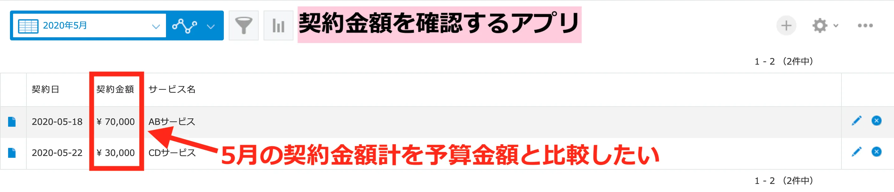 下記が契約管理アプリです。5月の契約金額が10万円とします。