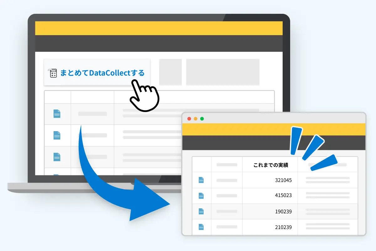 複数レコードの集計を一度に実行したい場合は、「まとめてDataCollectする」機能を使います。一覧画面から対象レコードを選び、ボタンをクリックするだけで、指定条件に基づいた一括集計・更新を自動で行えます。