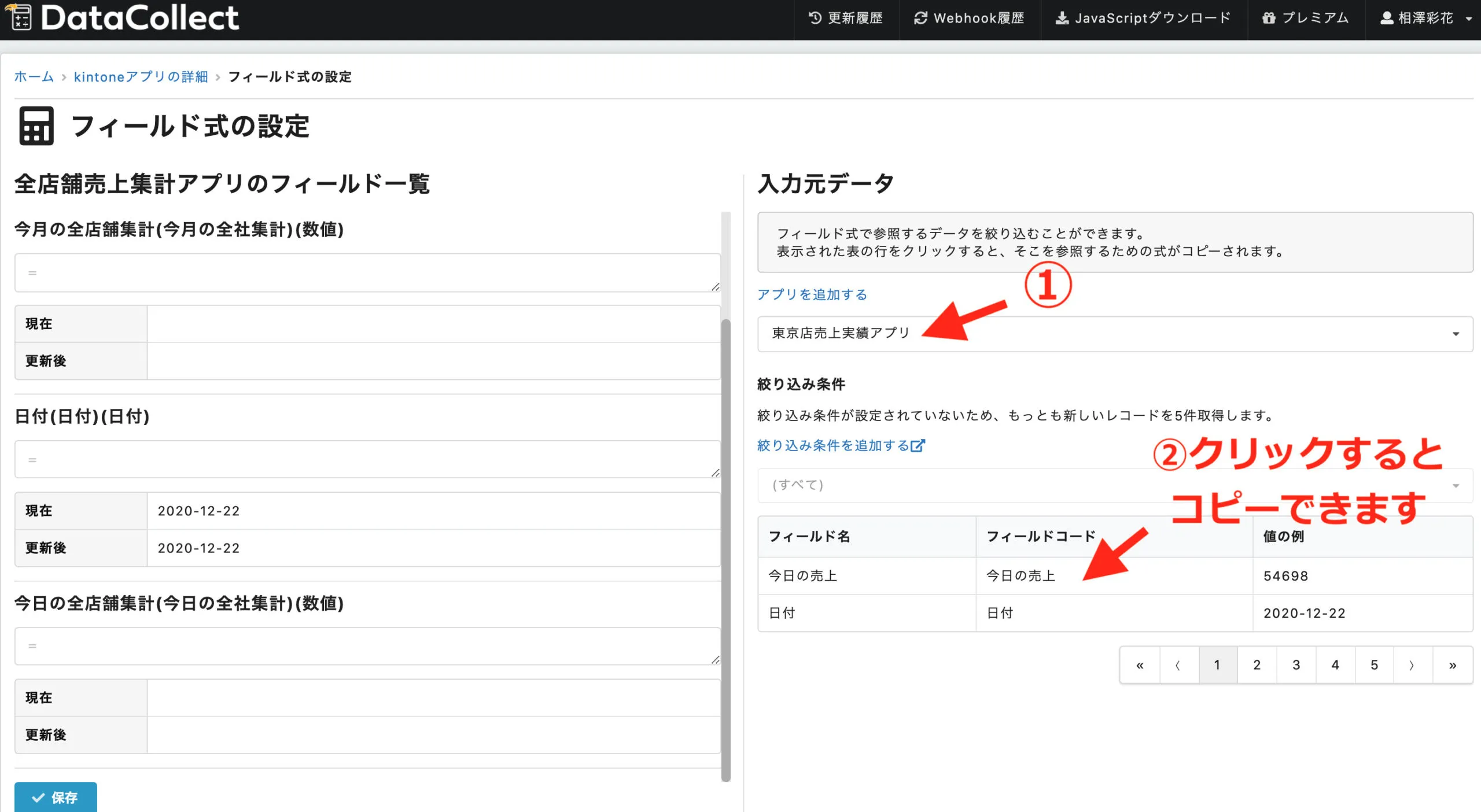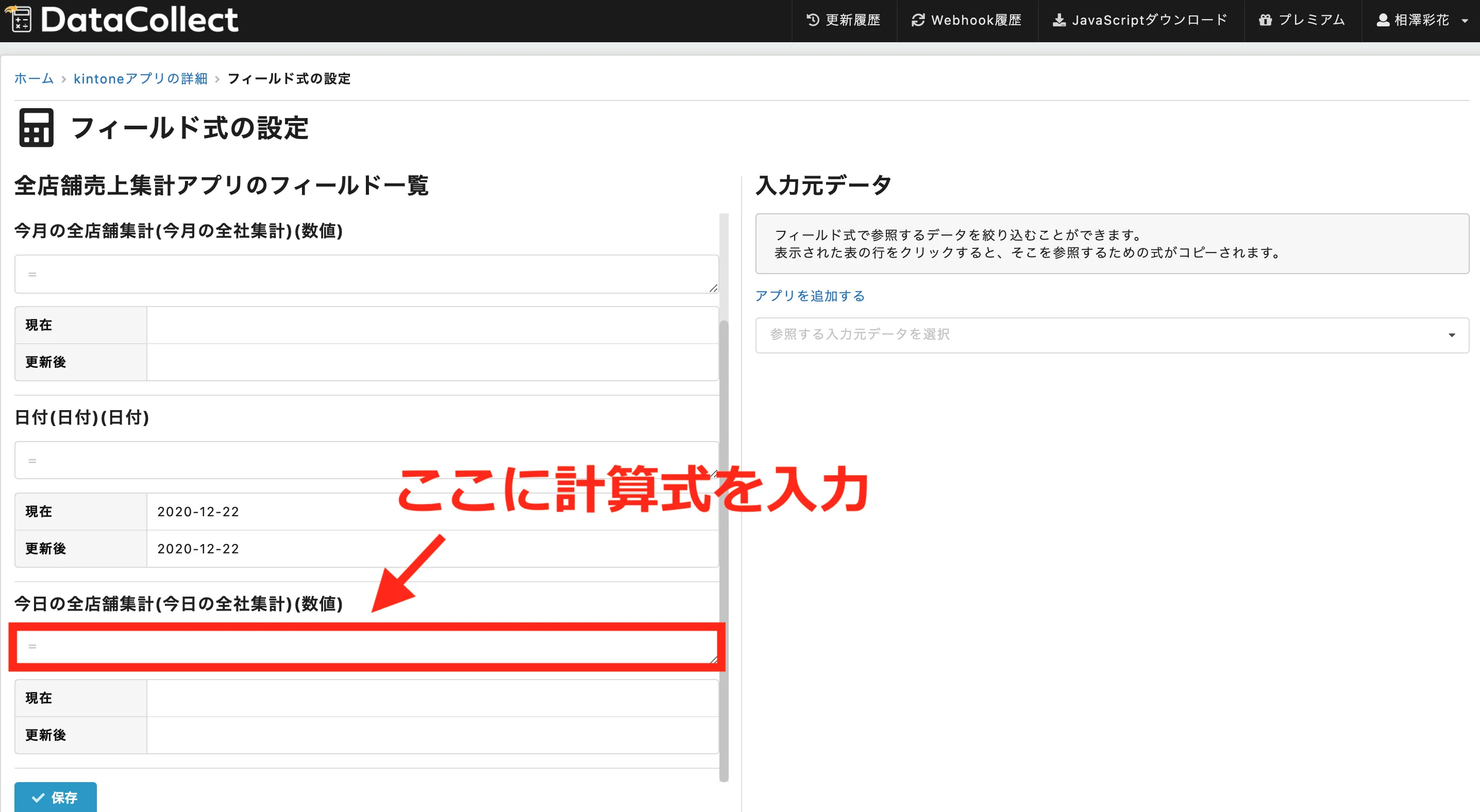 右側の東京店売上実績アプリの「今日の売上」のフィールドをコピーして、左側の計算式に入力します。